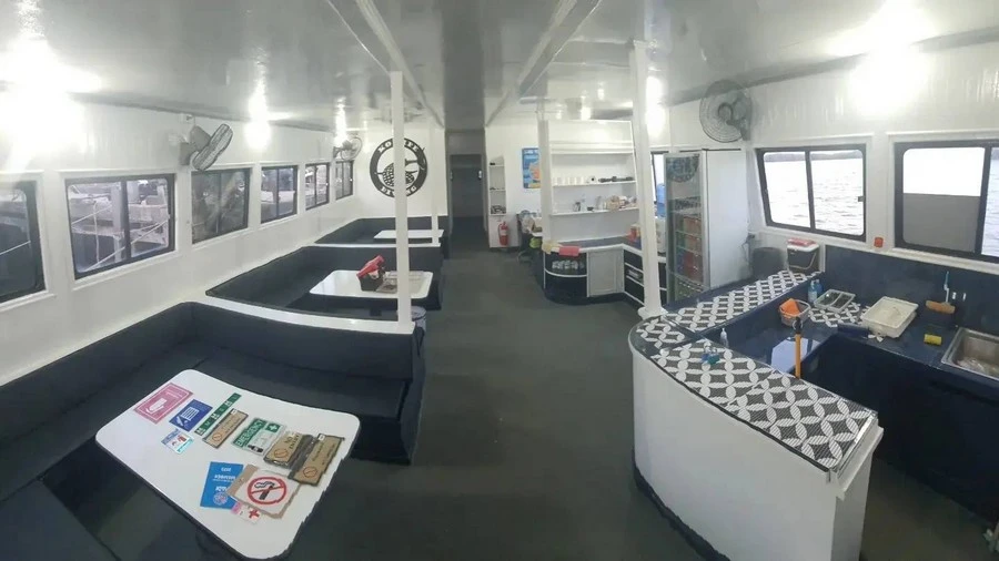 Inside, the boat boasts a spacious lounge area and a fully equipped bar, providing guests with the perfect spot to relax and socialize after a day of diving.